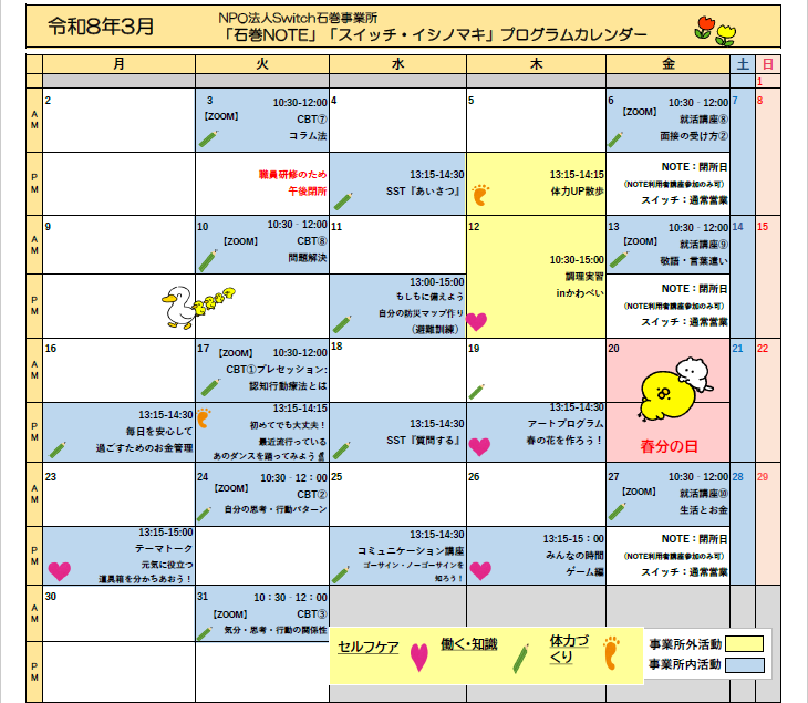 今月は、体力UP散歩・防災マップづくり・金銭管理・アートプログラム。