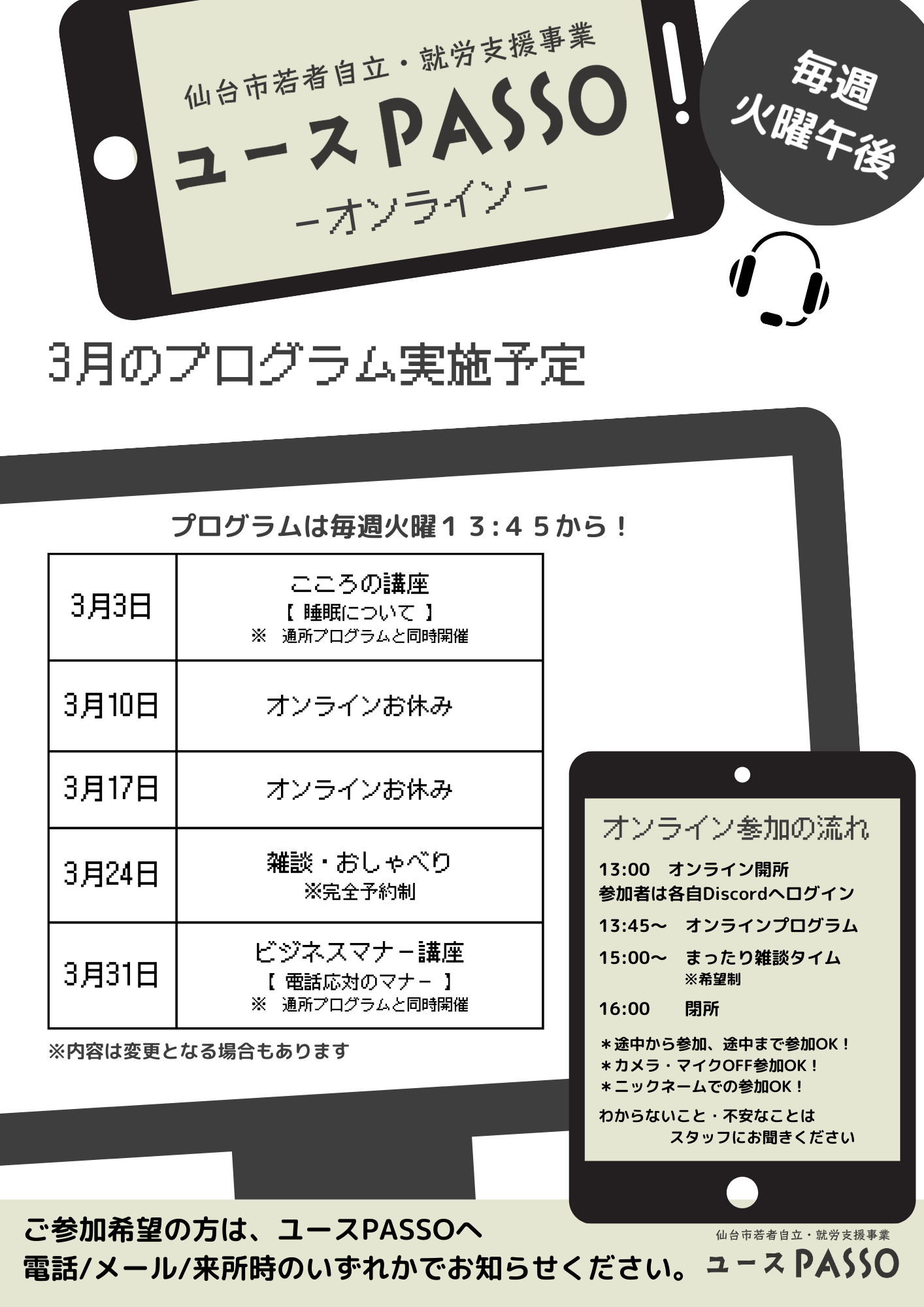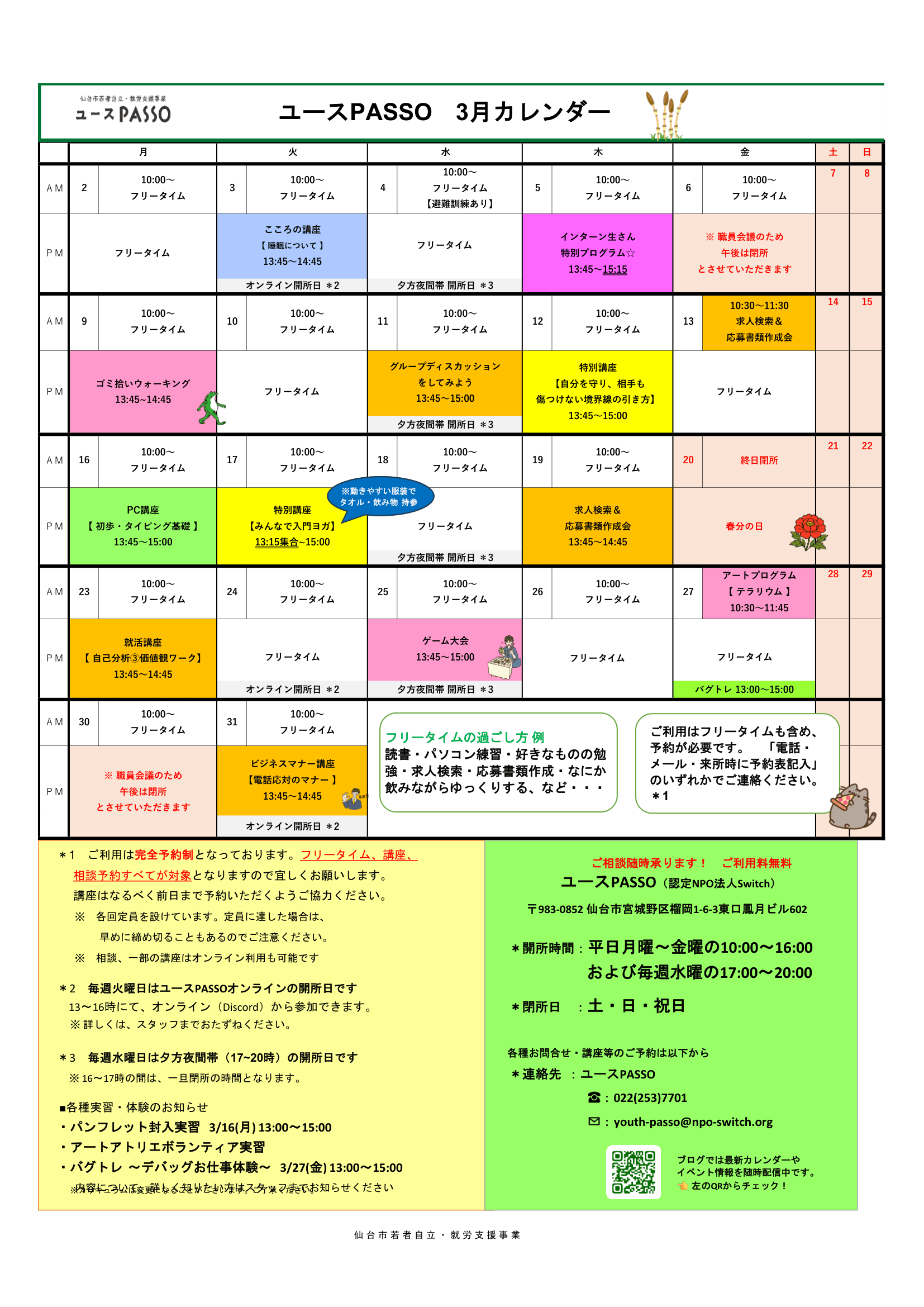 ユースPASSO3月のプログラムカレンダーをお知らせします。