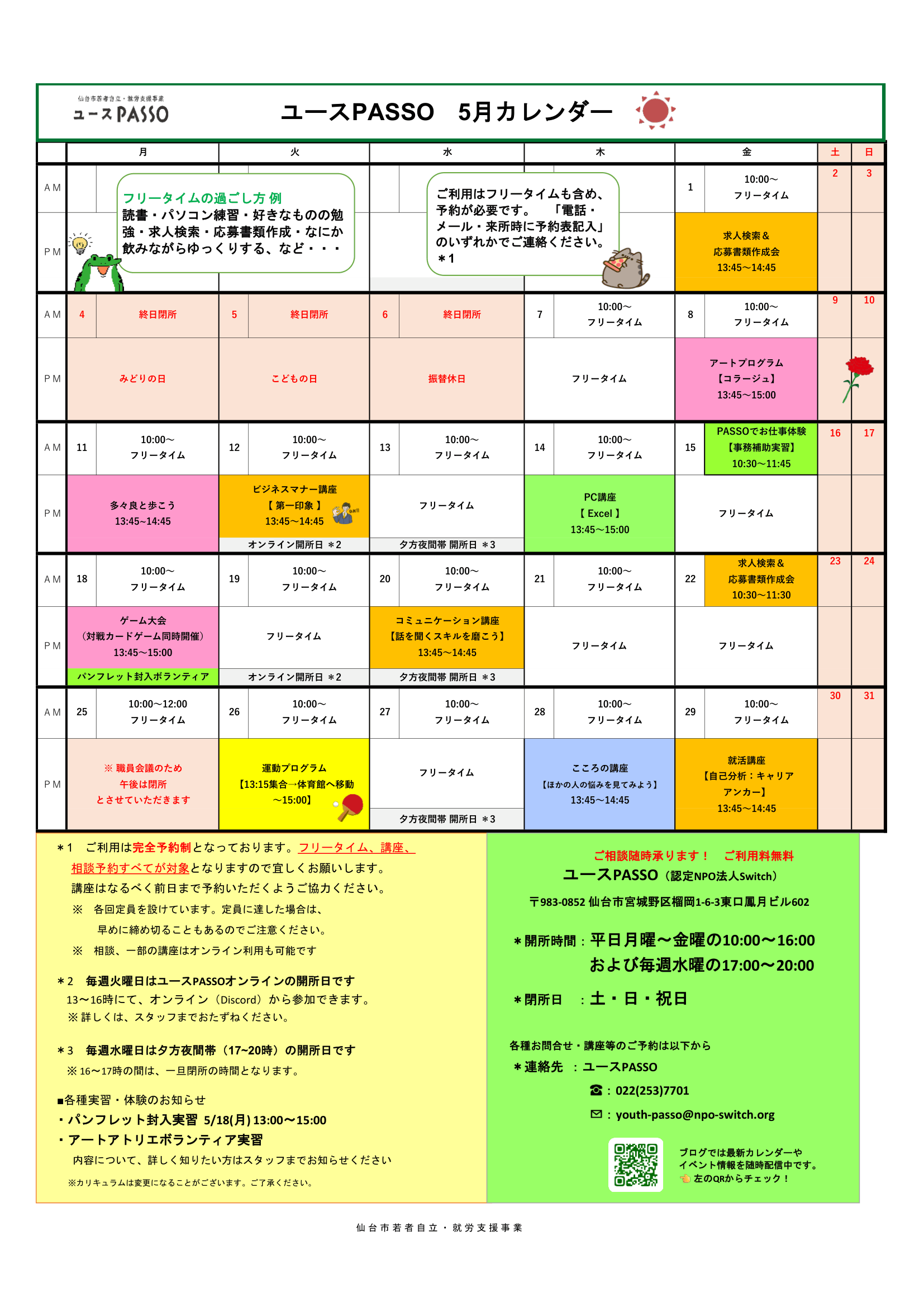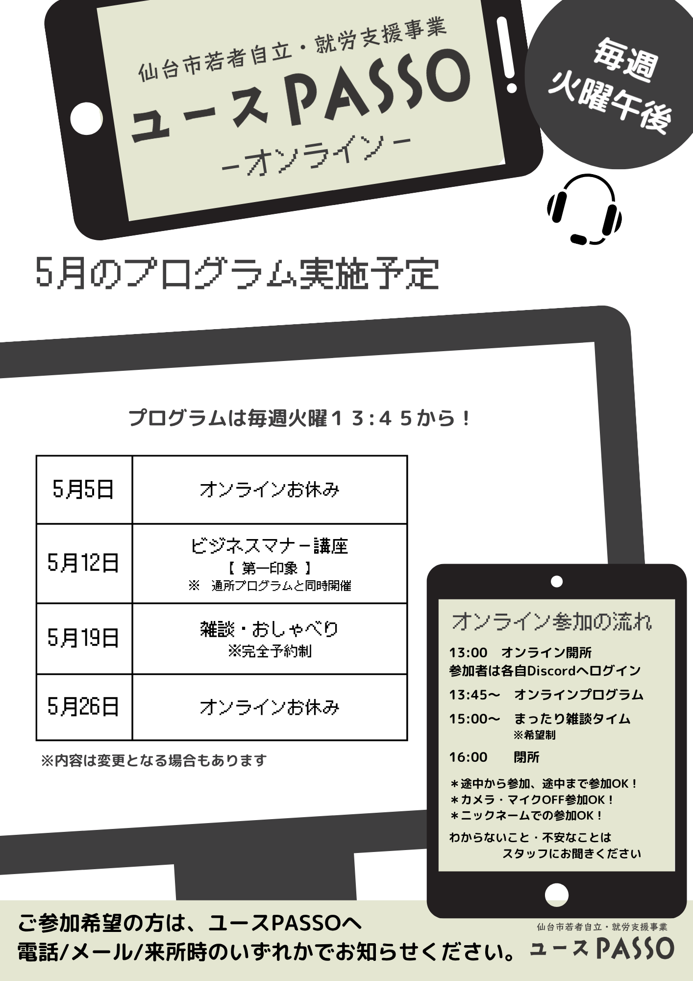 ユースPASSO5月のプログラムをお知らせいたします☀
