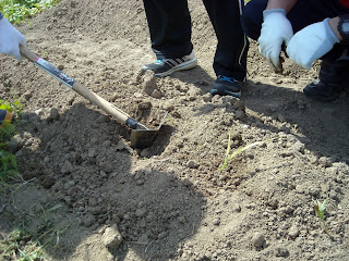 場所が決まり穴を掘って、 トウモロコシ・ミニトマト・インゲン豆を植えてきました