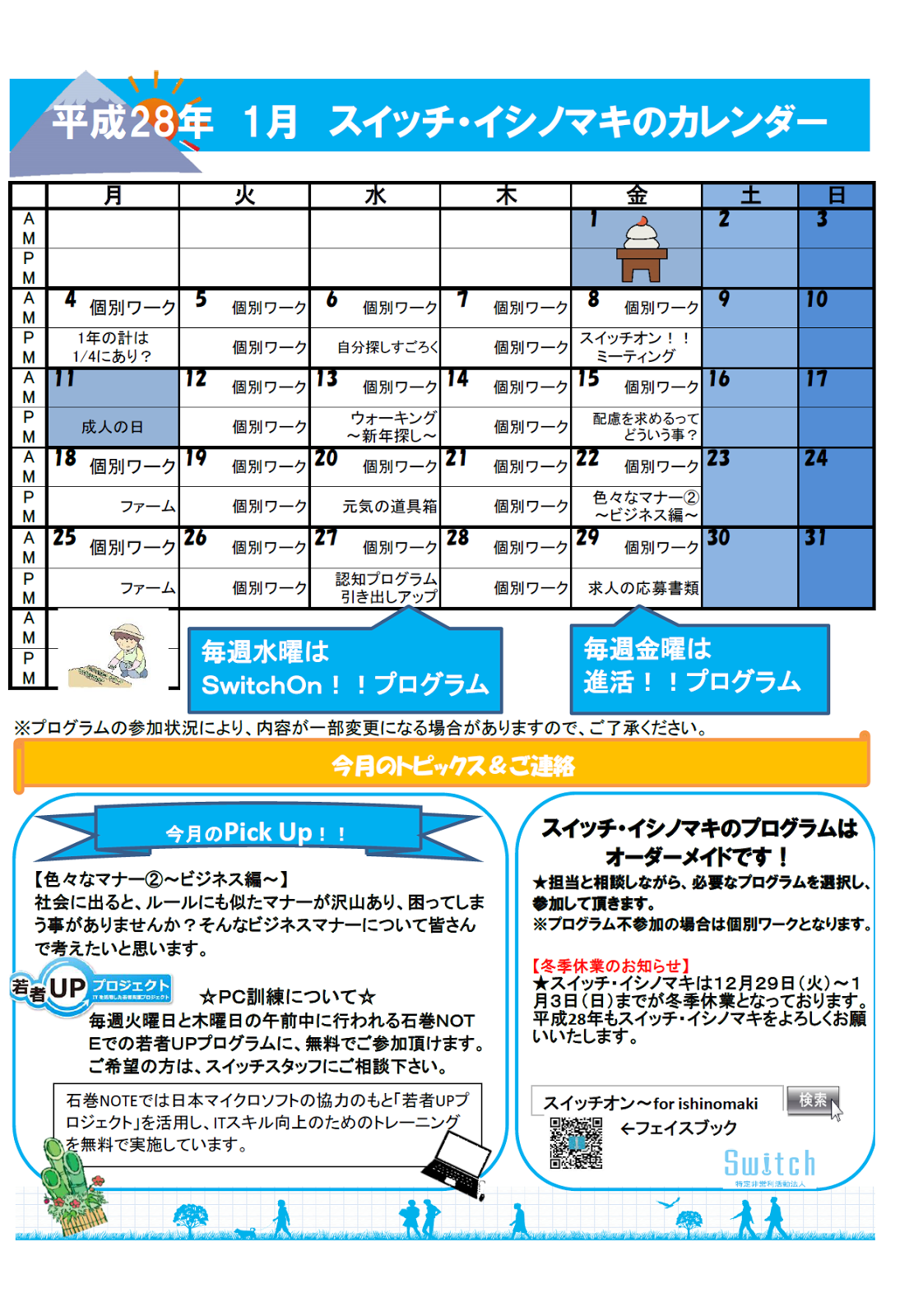 さて、スイッチ・イシノマキの1月は、前半は少しゆったりとしたプログラムを中心に徐々にギアを上げていけるような活動をしていきたいと思います。