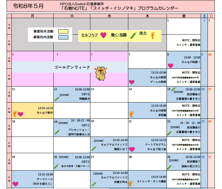 5月のプログラムカレンダーのご案内です。ご自身のペースで、無理なくご参加
