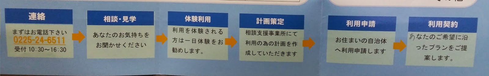①連絡:まずはご連絡下さい。そこで、相談、見学の日程の予約をさせて頂きます。