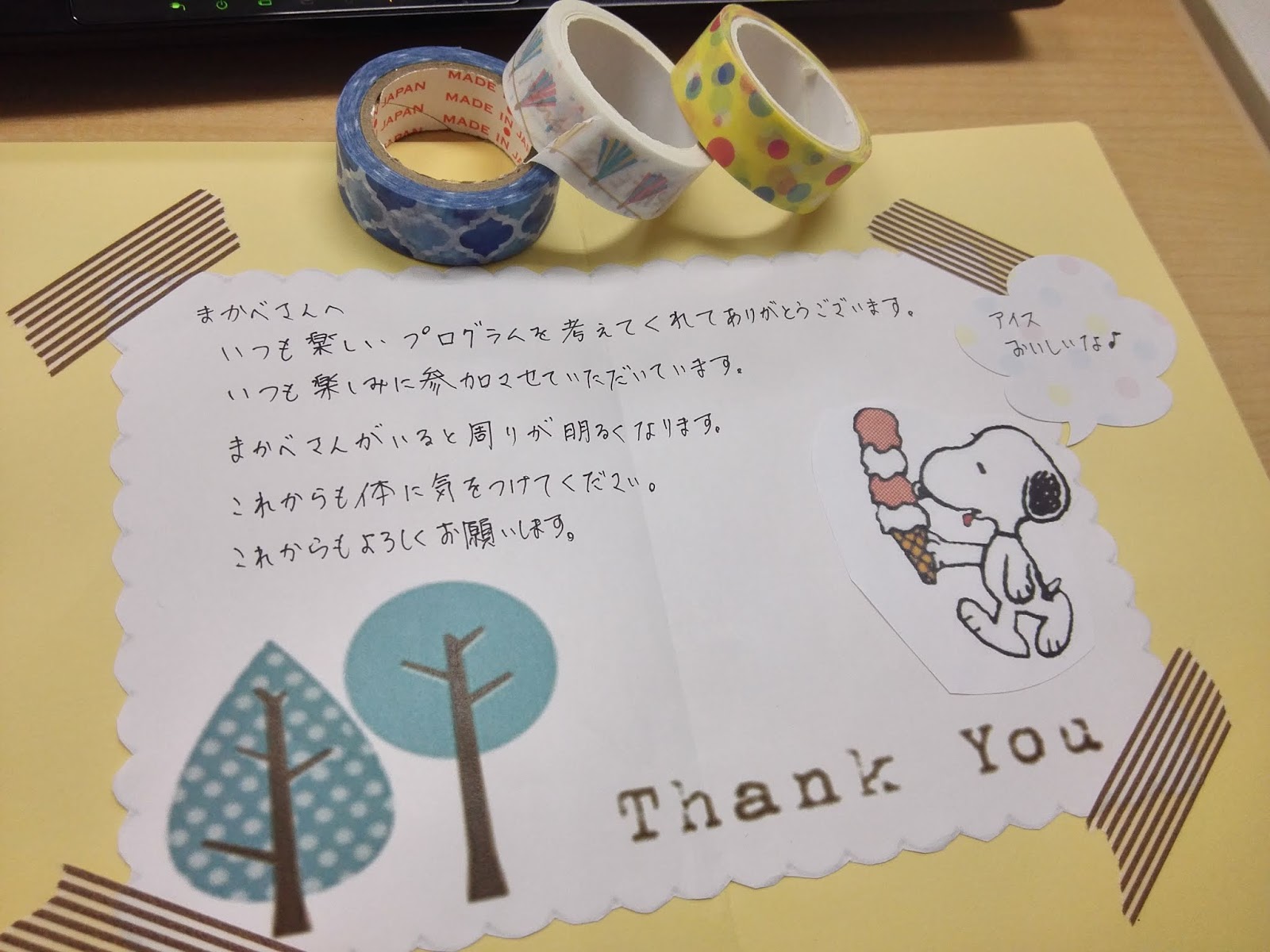 作り方は紙を丁度良い大きさに切って、そこにマスキングテープやキャラクターの紙を印刷し、貼り付けそこに感謝の言葉を書くという作り方でした。
