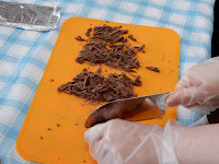 言葉にすると簡単に感じますが、チョコレートを湯煎しやすいように細かく刻む作業が意外と難しく、チョコレートが思っていた以上に固くしっかり刻もうと手に力を込めると、手の熱でチョコレートの表面が少し溶けだしそちらに気が取られてしまいました。