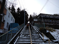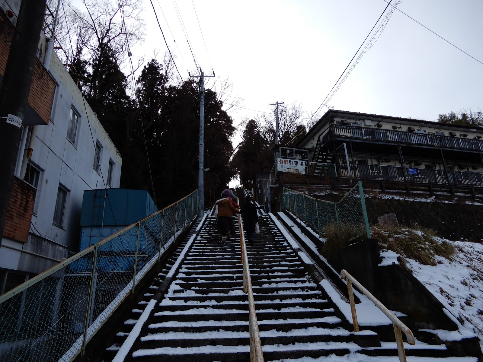 雪の残る急階段の参道を恐る恐る上がっていきます。