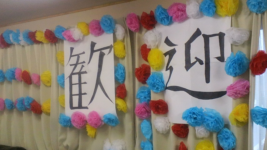 カーテンを使って、「歓 迎」の文字を紙花で飾ることに。