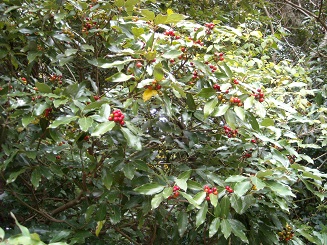 階段の途中で、万両(?)の実が綺麗に赤く色づいていました