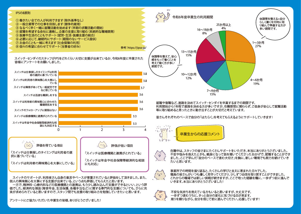 また、令和6年度の卒業生の皆様からスイッチ・センダイのサポート(IPS)について評価してもらった結果も載せています。