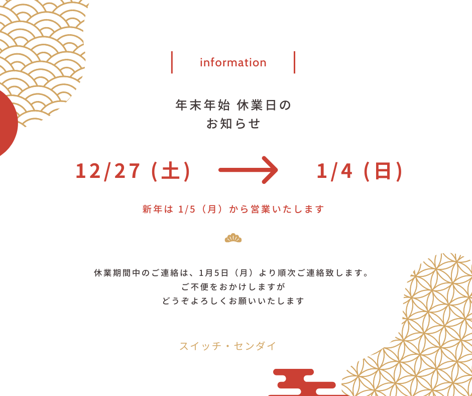 誠に勝手ながら、2025年12月27日(土)~2026年1月4日(日)までを、年末年始の休業とさせていただきます。