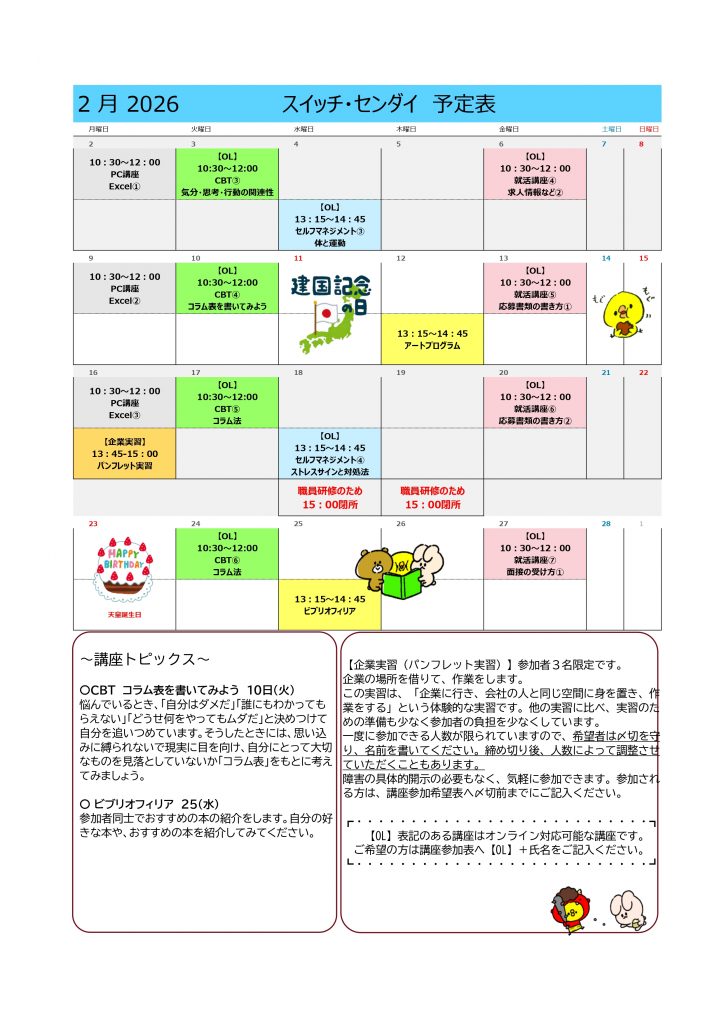さて、スイッチ・センダイ2月のプログラムカレンダーのお知らせです💝