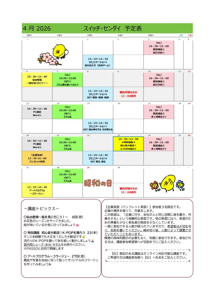 新年度の始まり、4月のプログラムカレンダーのお知らせです🍡