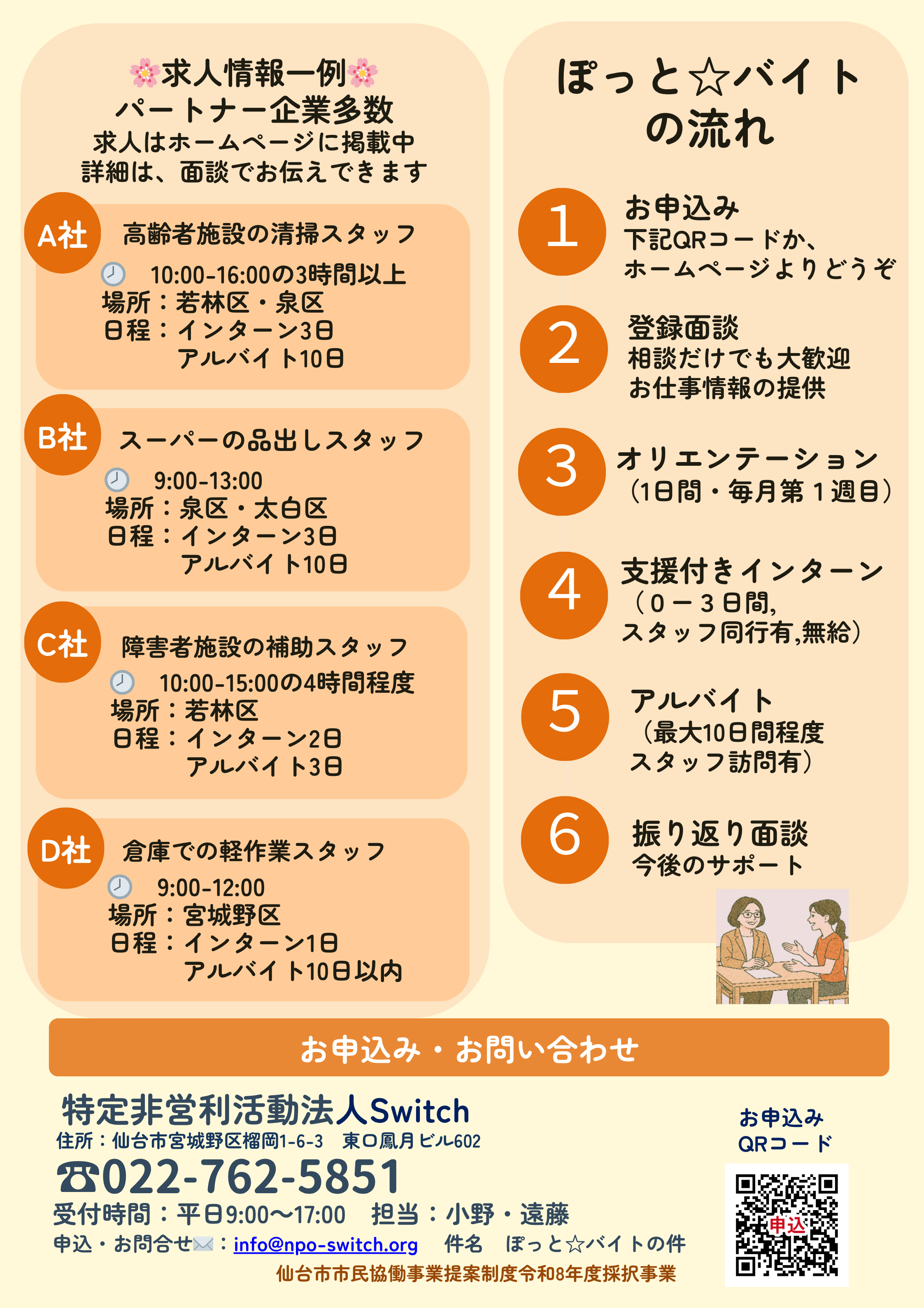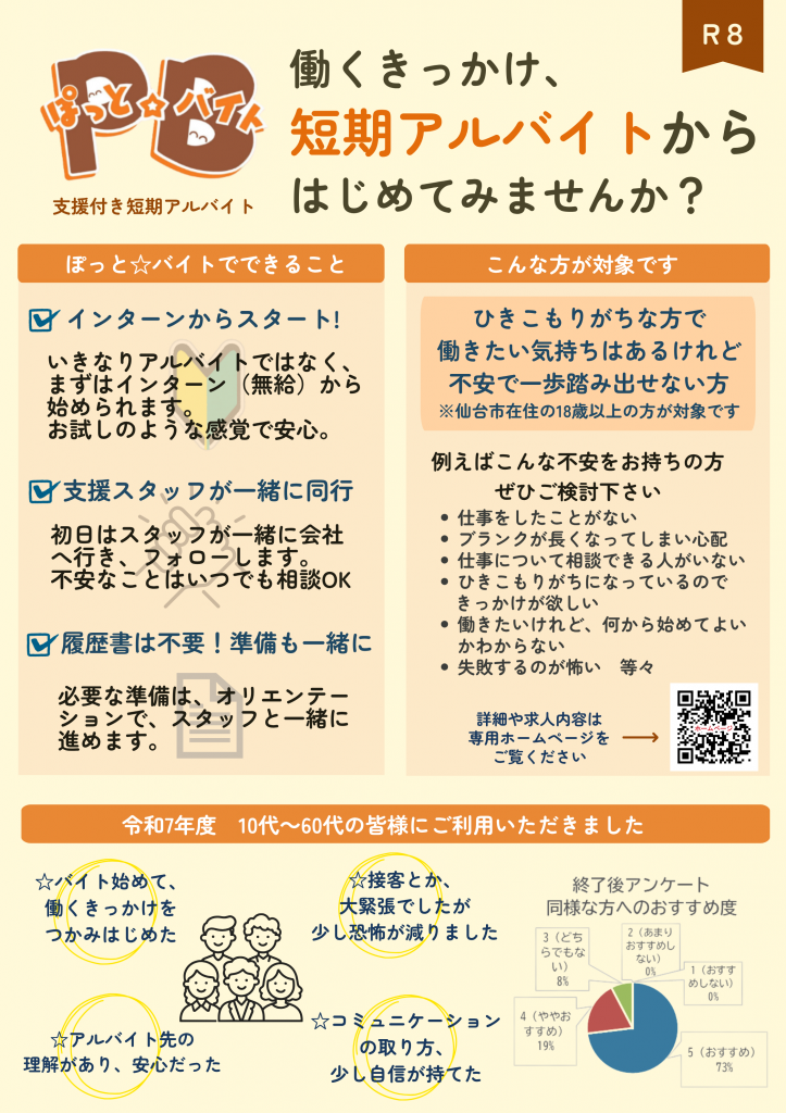 ひきこもりがちな方への支援付き短期アルバイト『ぽっと☆バイト』が今年度もスタートしました。